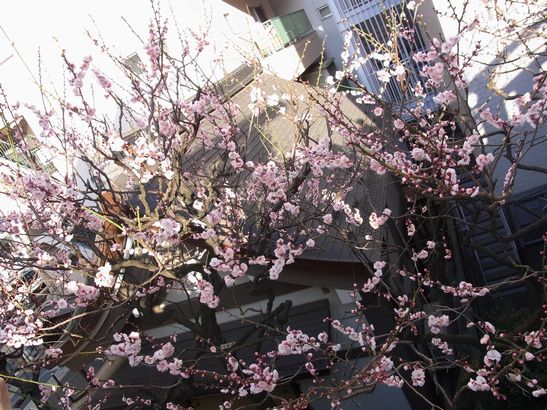 背景に住宅街が混ざってしまうのが残念ですが、太鼓の音をBGMに梅を堪能できて満足