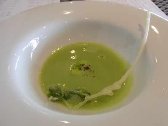 空豆の味が濃縮されたスープに揚げたセロリがのっています