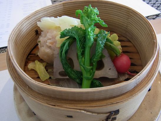 もちっとした海老しゅうまいと新鮮な春野菜の取り合わせ