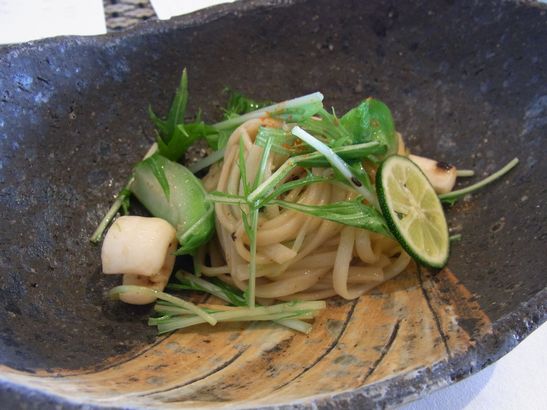 つぼみ菜と一夜干しいかの葛うどんパスタ