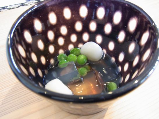 プルプルとした寒天ともちもちの白玉、爽やかな青みのうすいの実で少ないながらも満足な甘味