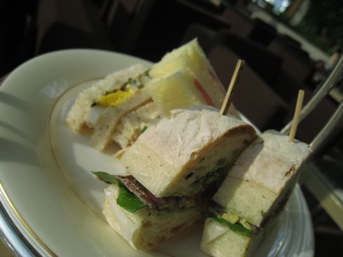上段:三種のサンドウィッチ(ツナタマゴマヨネーズ゙、アンチョビ゙とアーティチョークのフォカッチャサンド゙、サーモンとサワークリームのフィンガーサンド゙)